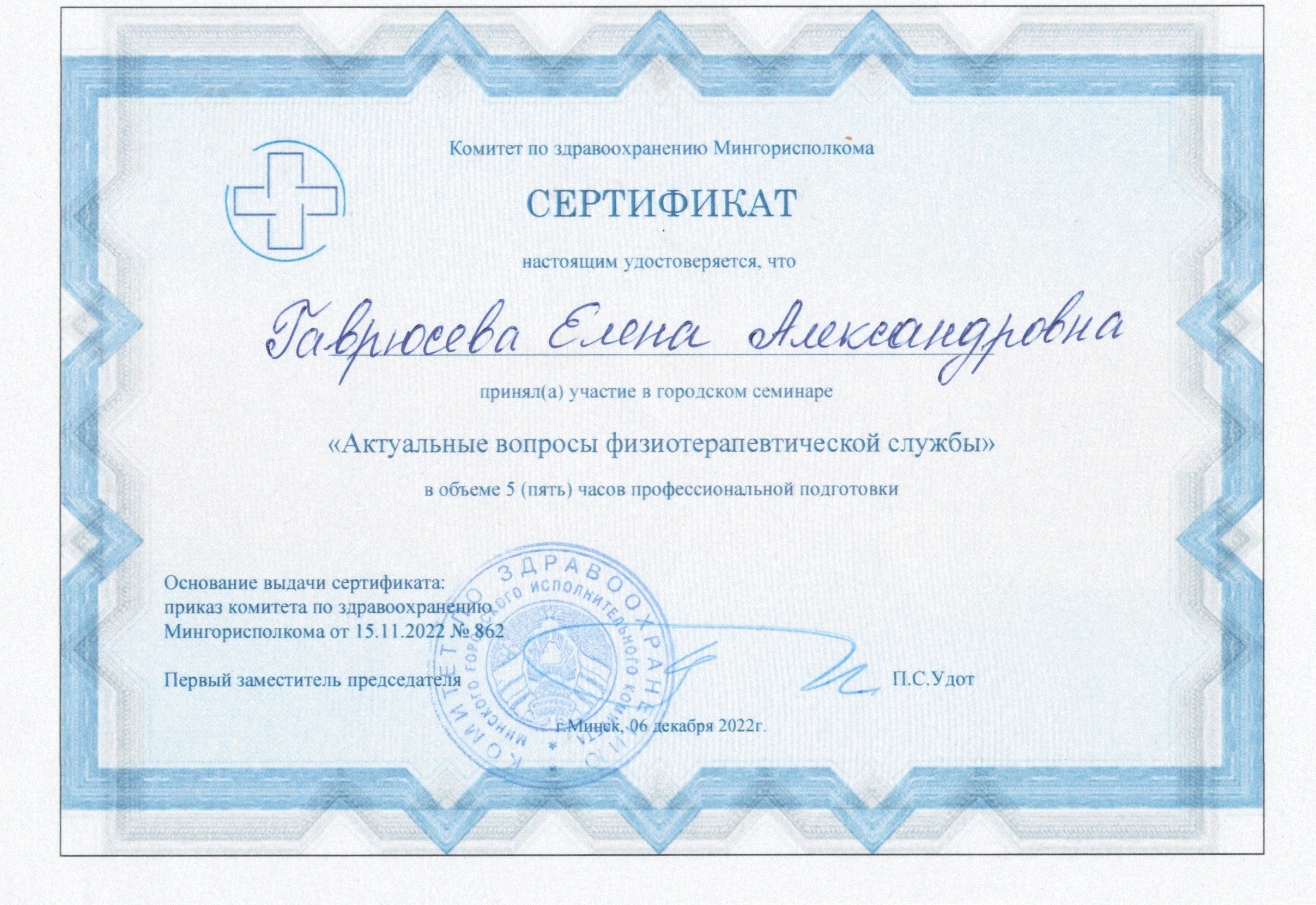 2022 г., Минск – Городской семинар «Актуальные вопросы физиотерапевтической службы»;
