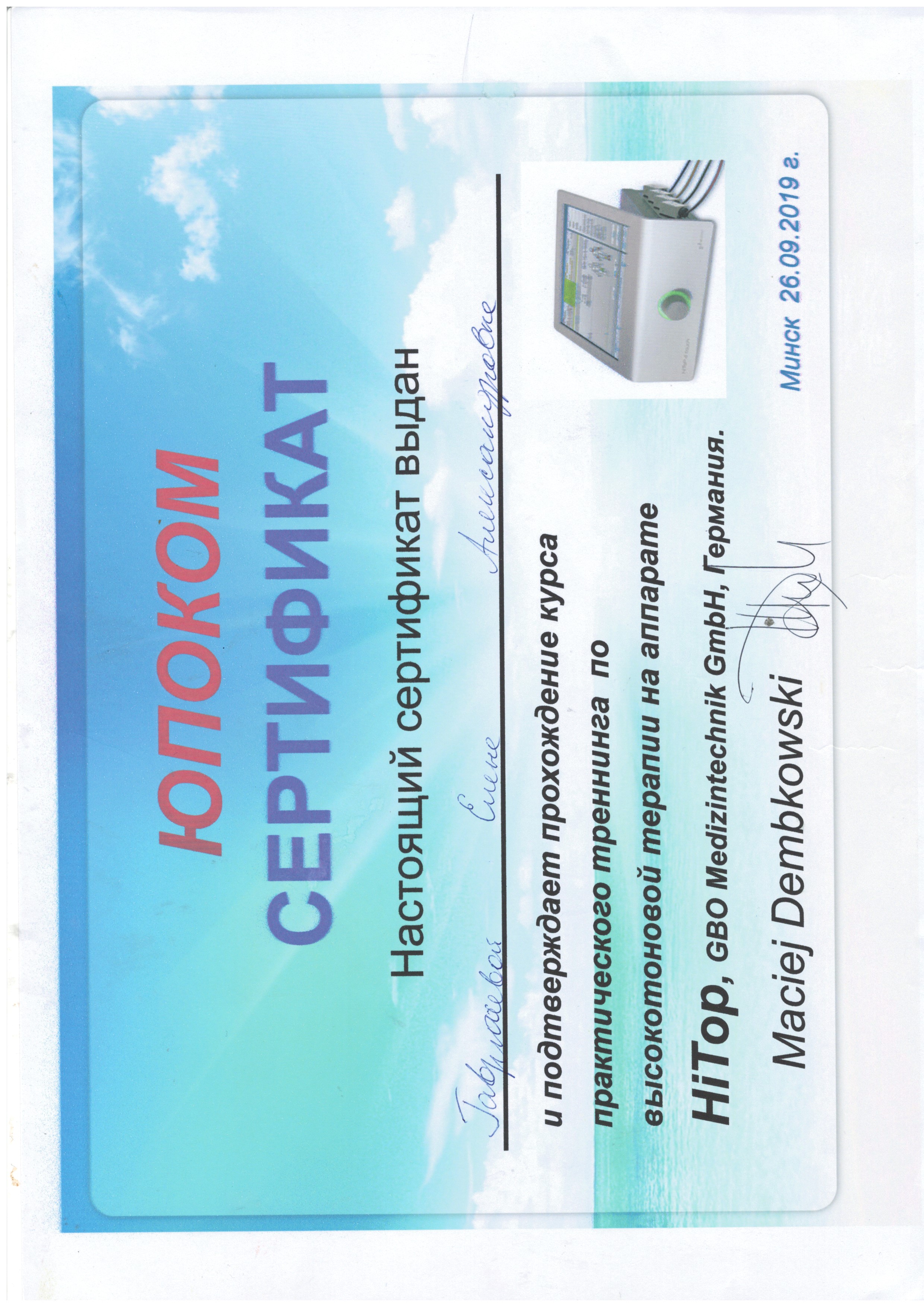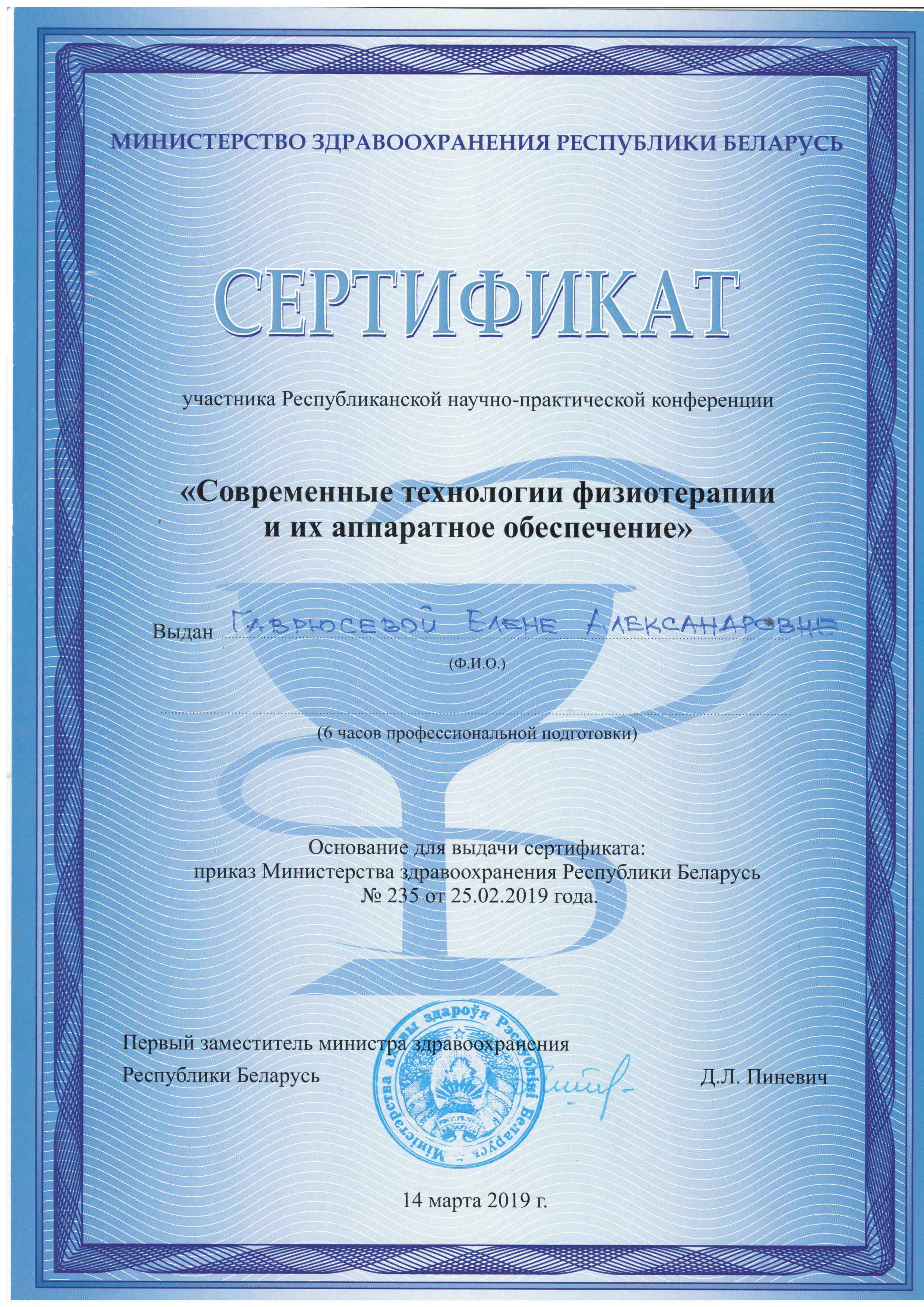2018 г. – «Физиотерапевтические реабилитационные технологии», БелМАПО;