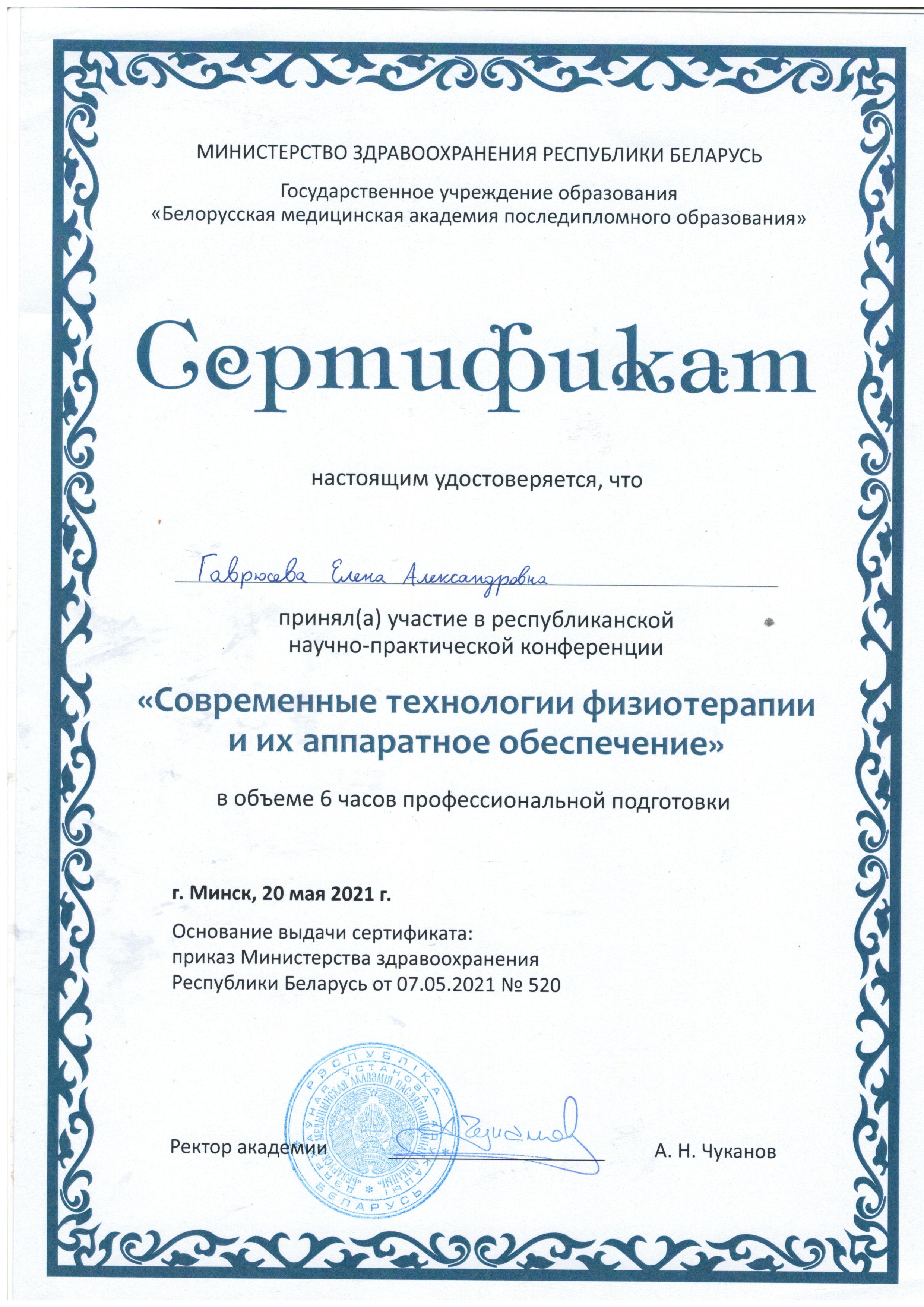 2021 г. – «Инновационные физиотерапевтические технологии на этапах реабилитации пациентов кардиологического профиля», БелМАПО;