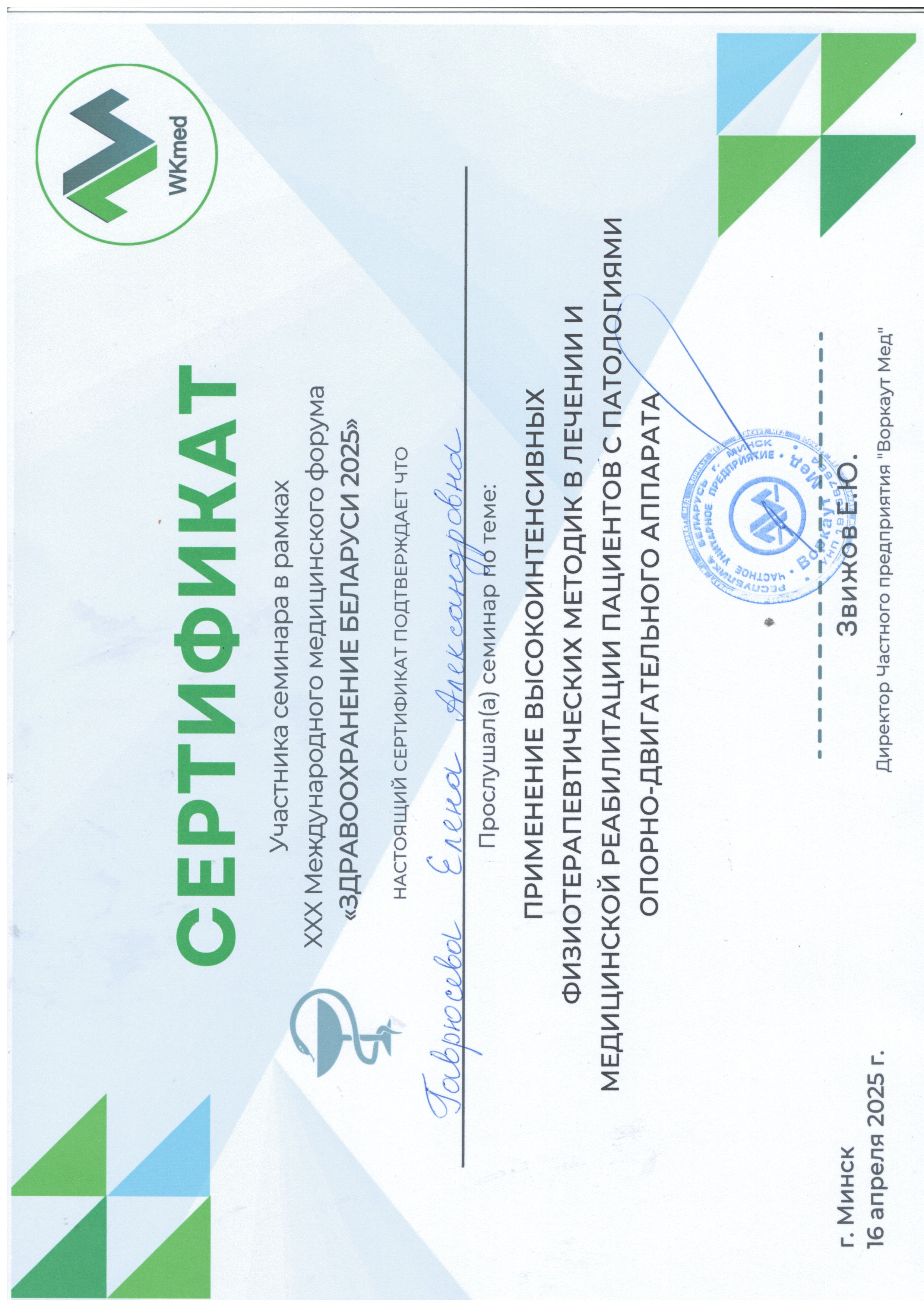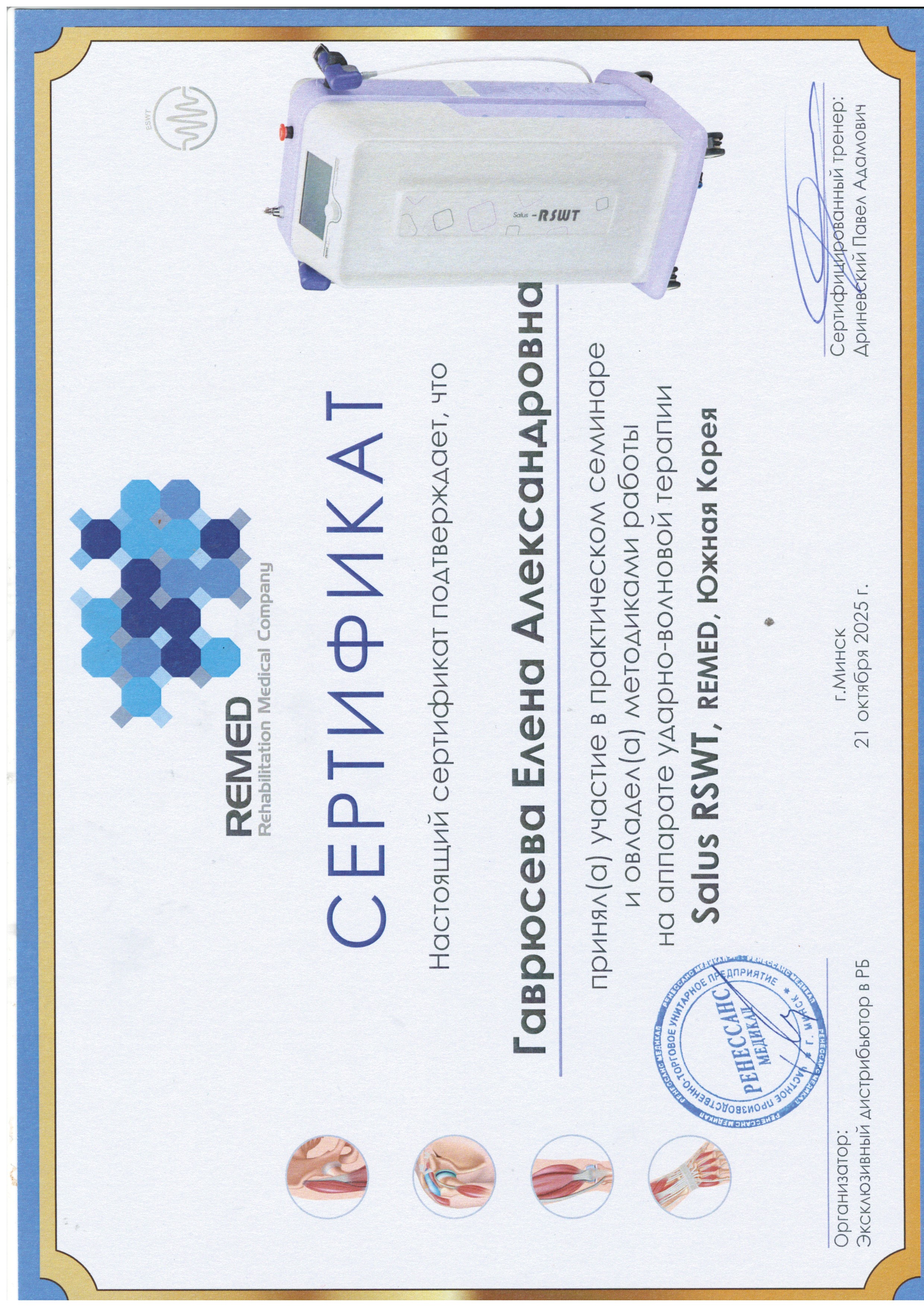 2025 г., Минск – Республиканский семинар « Применение высокоинтенсивных физиотерапевтических методик в лечении и реабилитации пациентов с патологий опорно- двигательного аппарата».