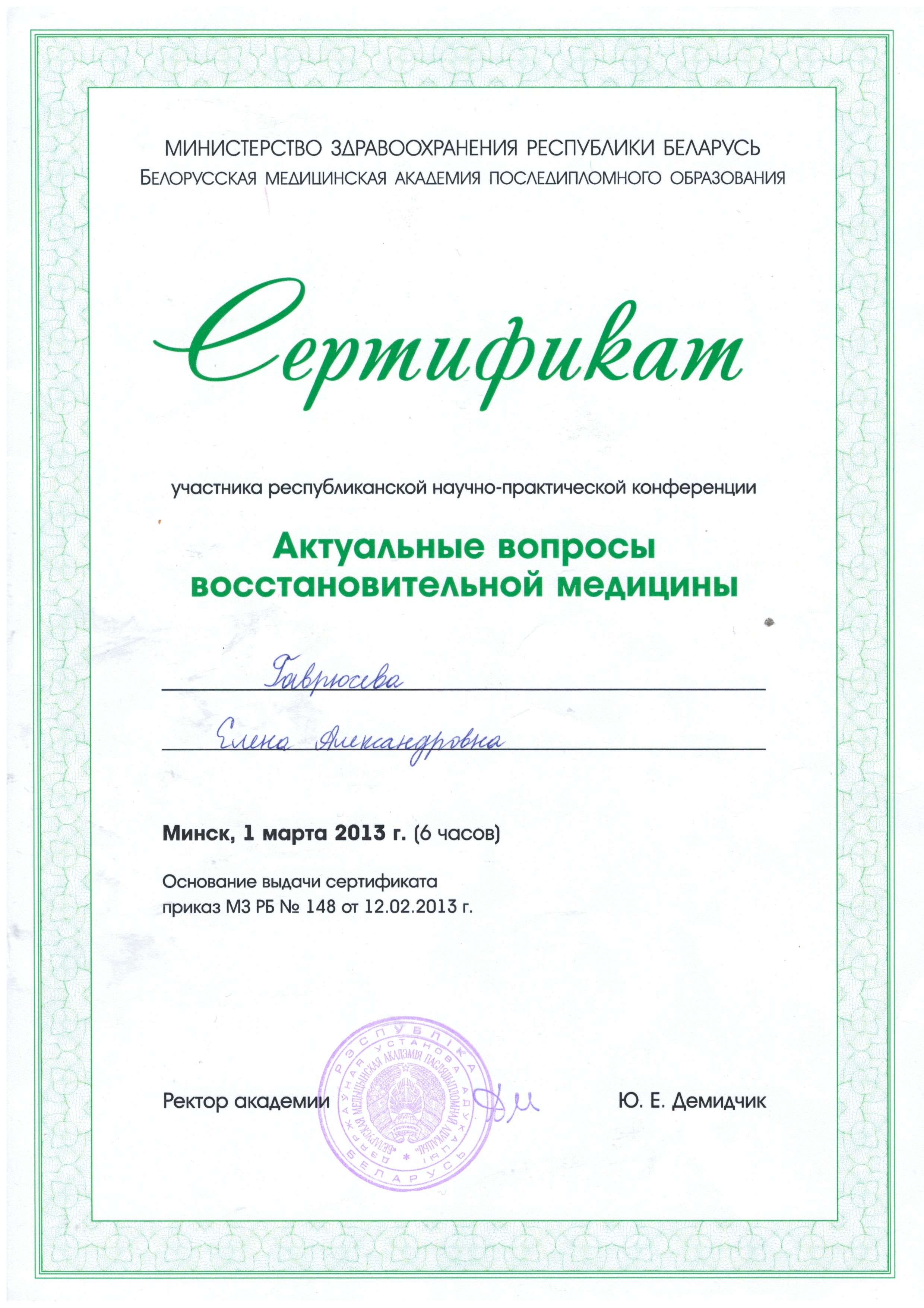 2013 г., Минск – Республиканская научно- практическая конференция «Актуальные вопросы восстановительной медицины»;
