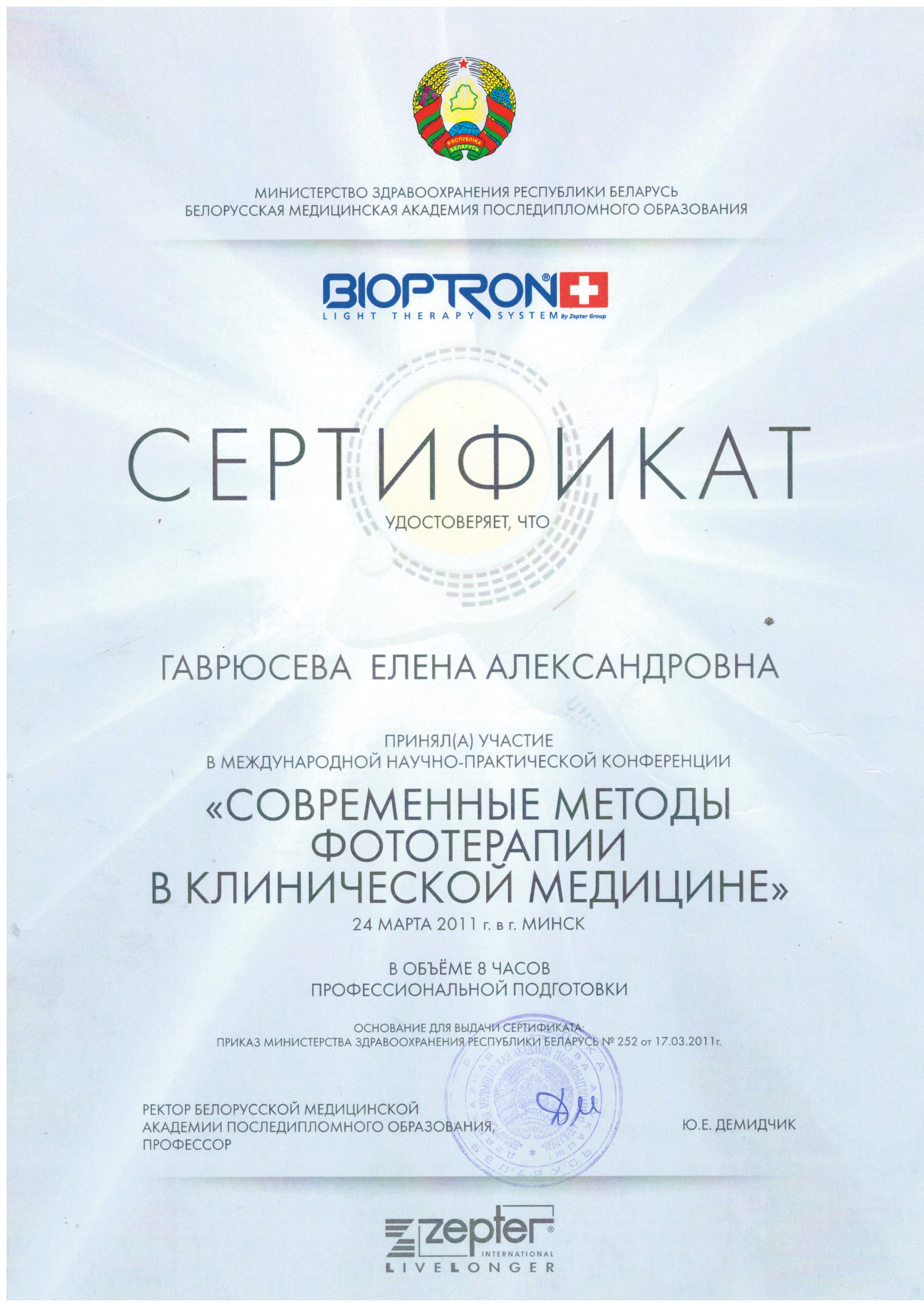 2011 г., Минск – Международная научно-практическая конференция «Современные методы фототерапии в клинической медицине»;