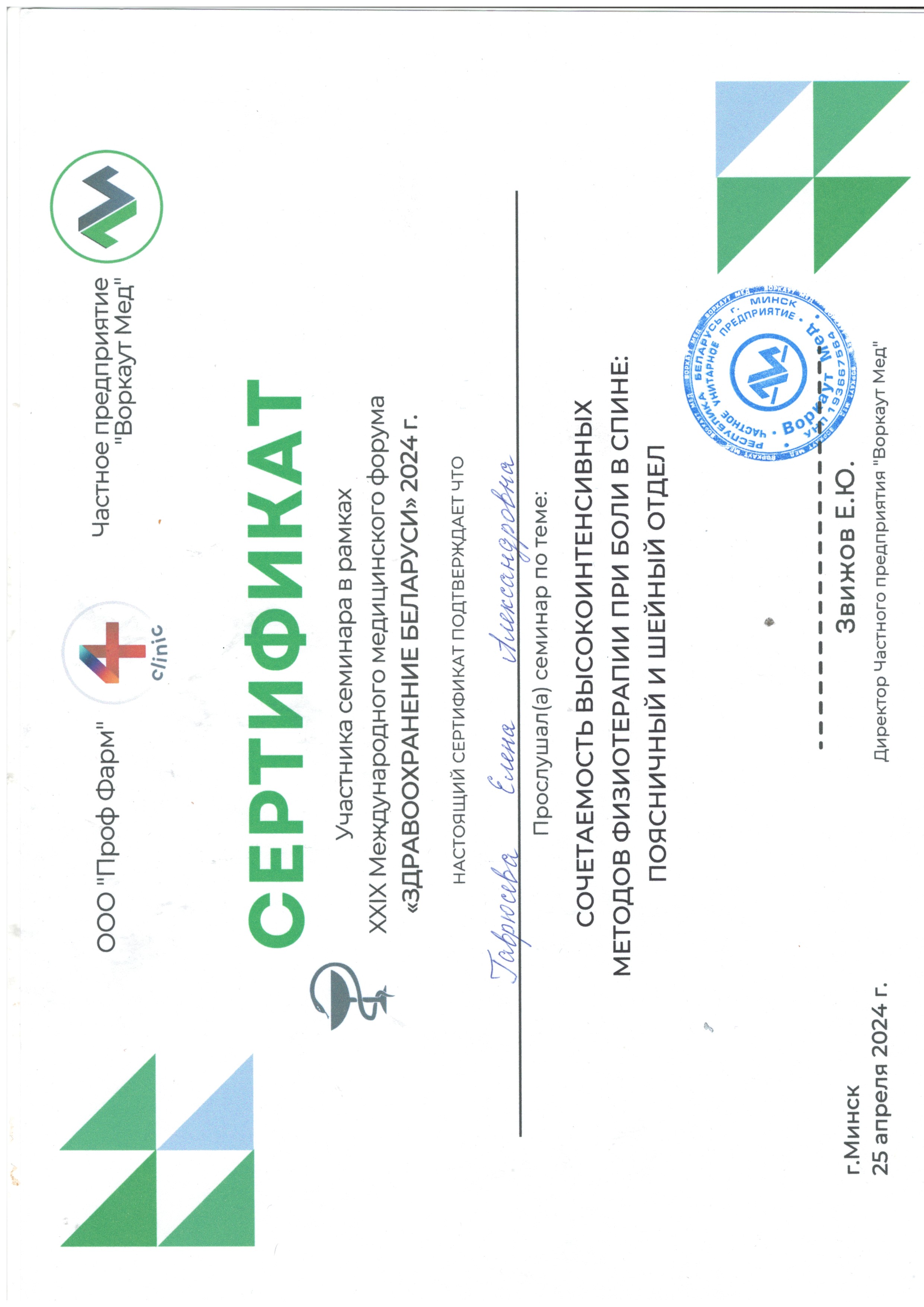 2024 г., Минск – Республиканский семинар «Сочетаемость высокоинтенсивных методов физиотерапии при боли в спине»;