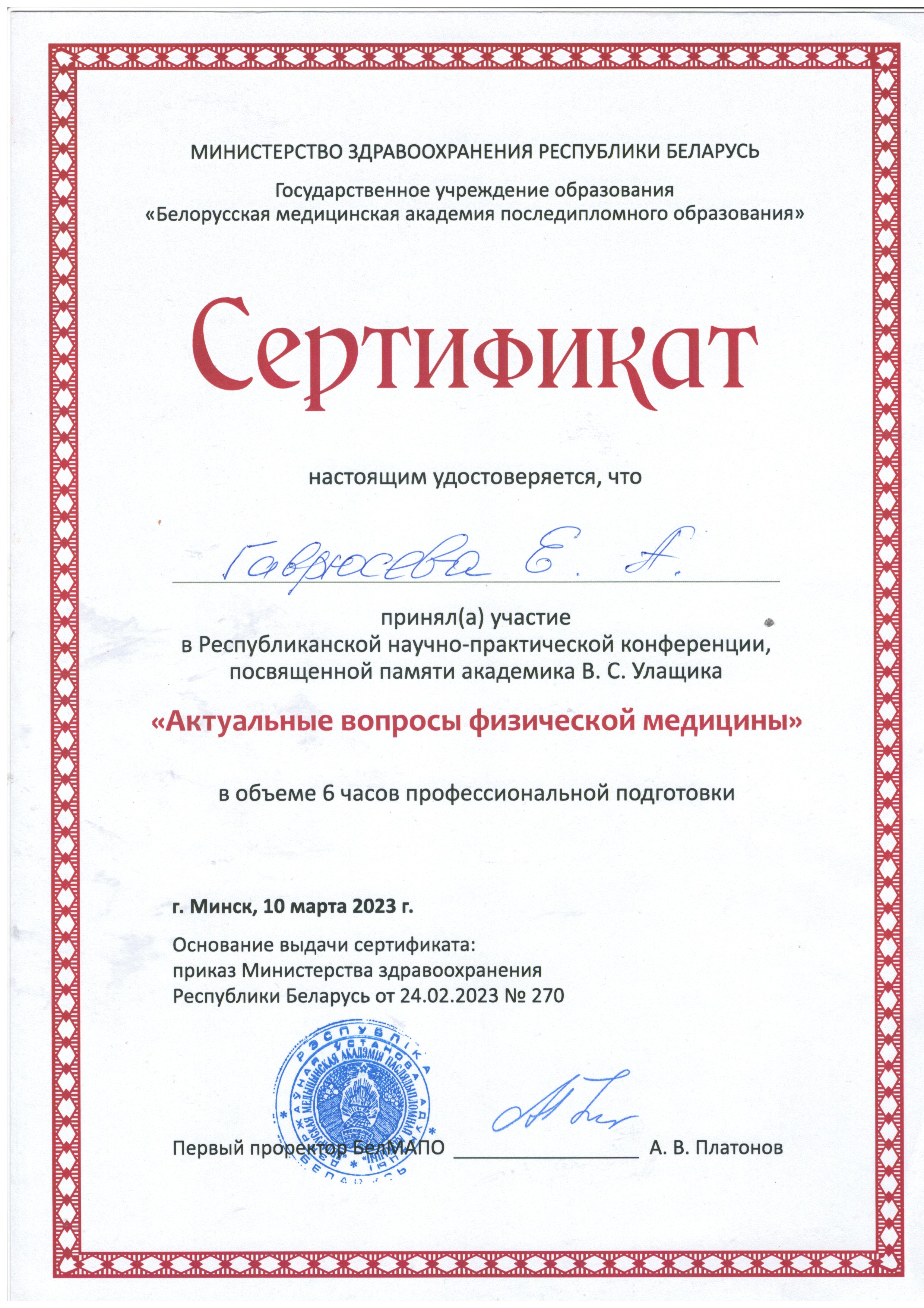 2023 г. – «Озонотерапия и карбокситерапия в клинической практике и косметологии», БелМАПО;