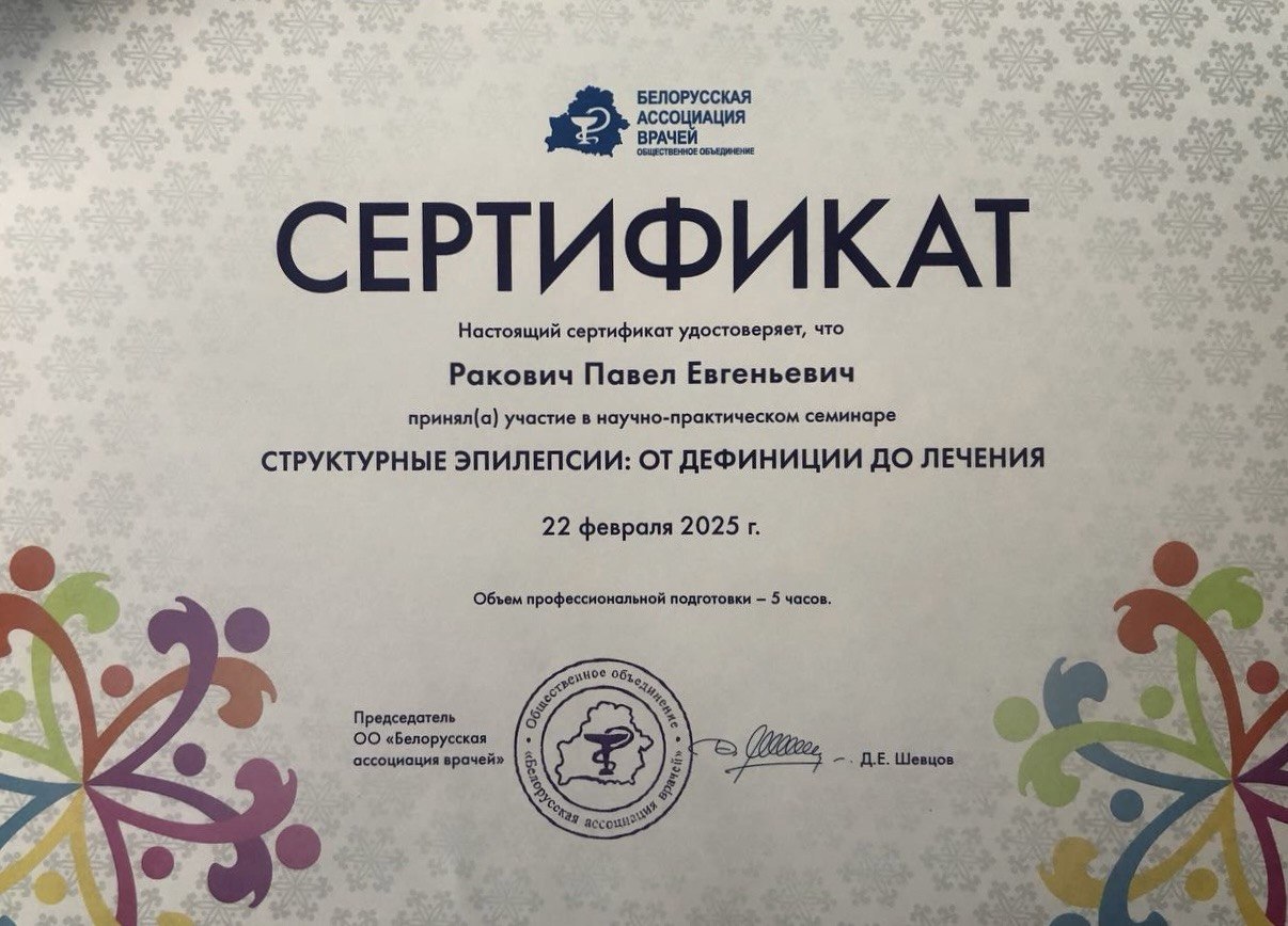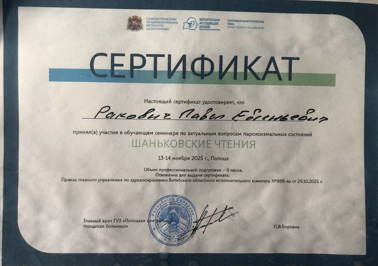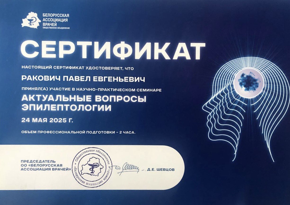 Врач-невролог первой категории Ракович Павел Евгеньевич занимается диагностикой и лечением эпилепсии и пароксизмальных расстройств, демиелинизирущих заболеваний; диагностикой, лечением и профилактикой вертеброгенной патологии, периферических невропатий, сосудистой, дегенеративной патологии. Выполняет все виды лекарственных блокад.