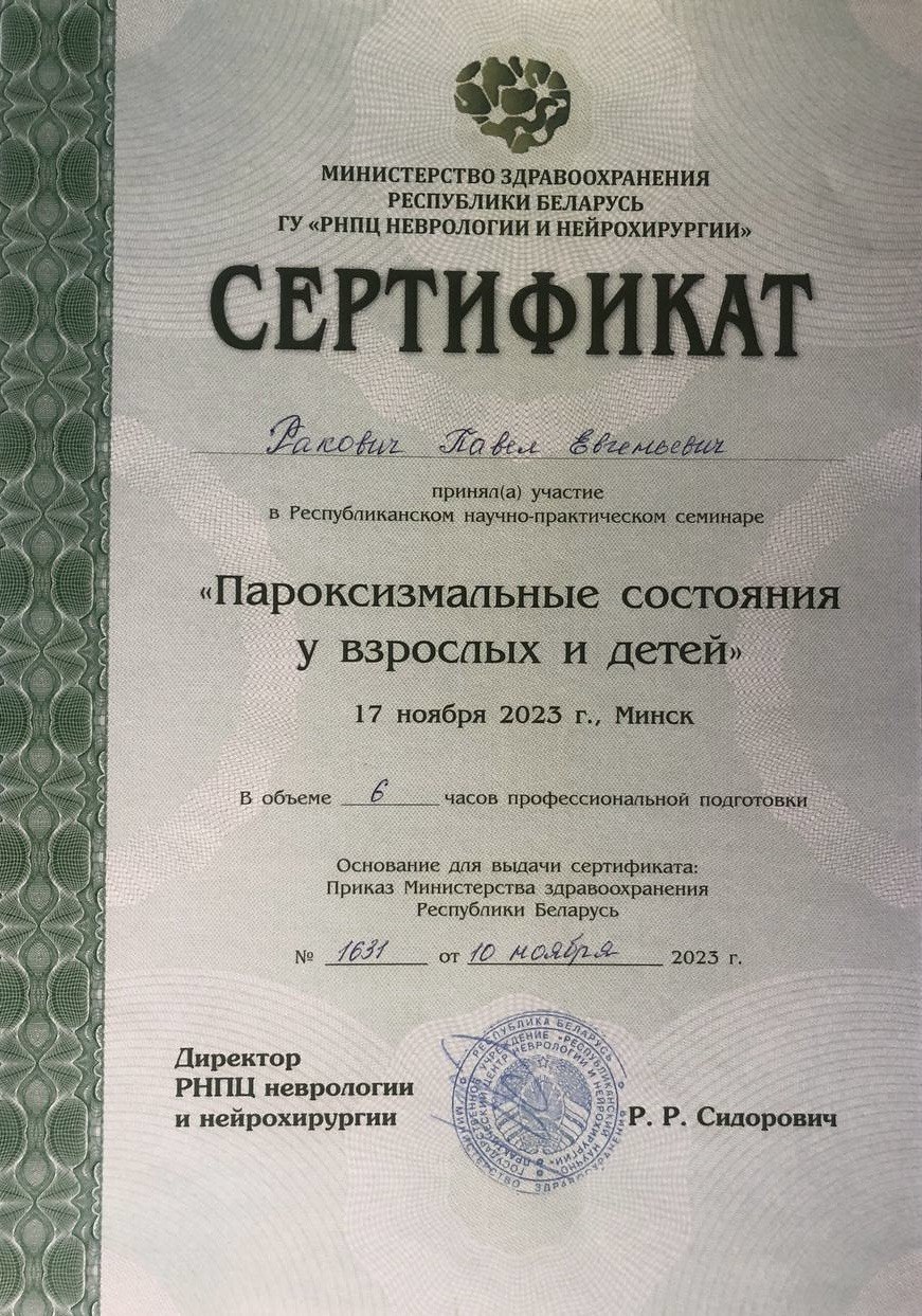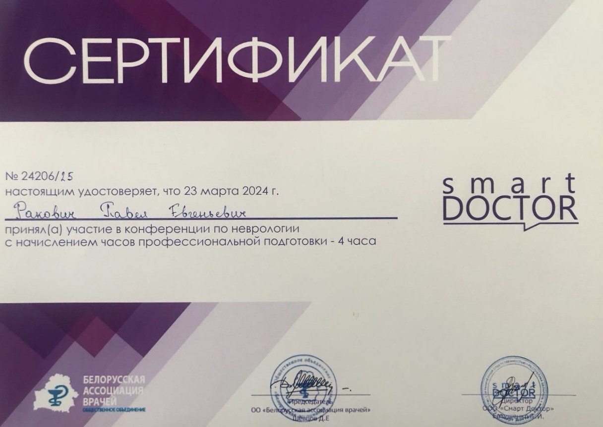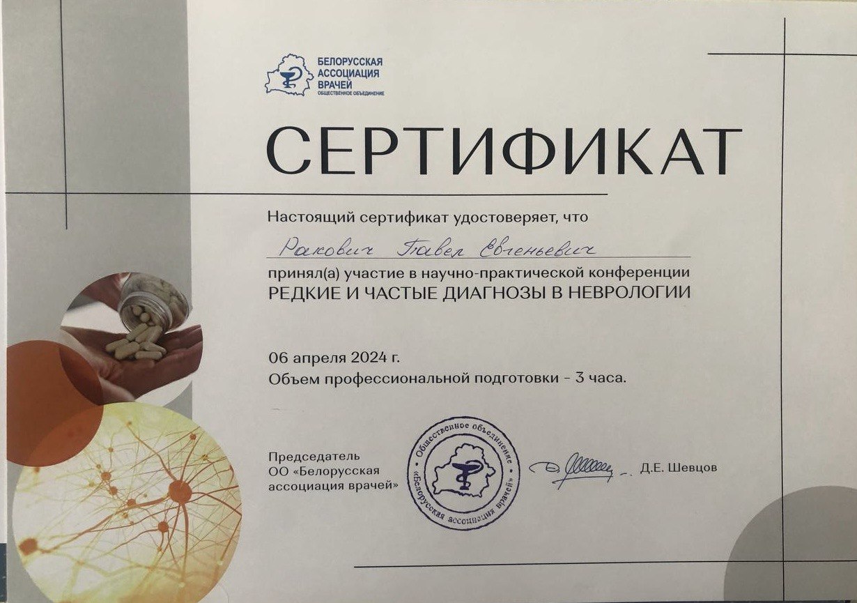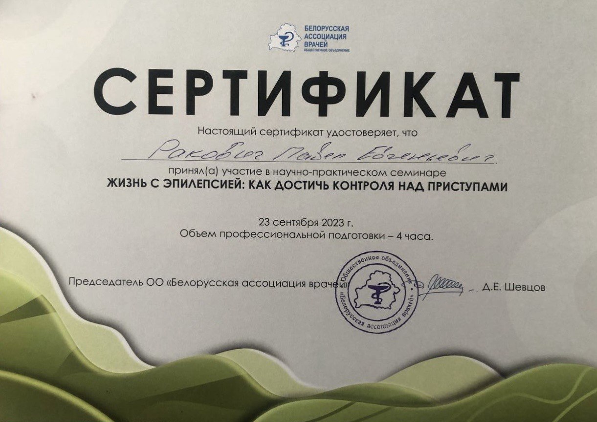 Врач-невролог первой категории Ракович Павел Евгеньевич занимается диагностикой и лечением эпилепсии и пароксизмальных расстройств, демиелинизирущих заболеваний; диагностикой, лечением и профилактикой вертеброгенной патологии, периферических невропатий, сосудистой, дегенеративной патологии. Выполняет все виды лекарственных блокад.