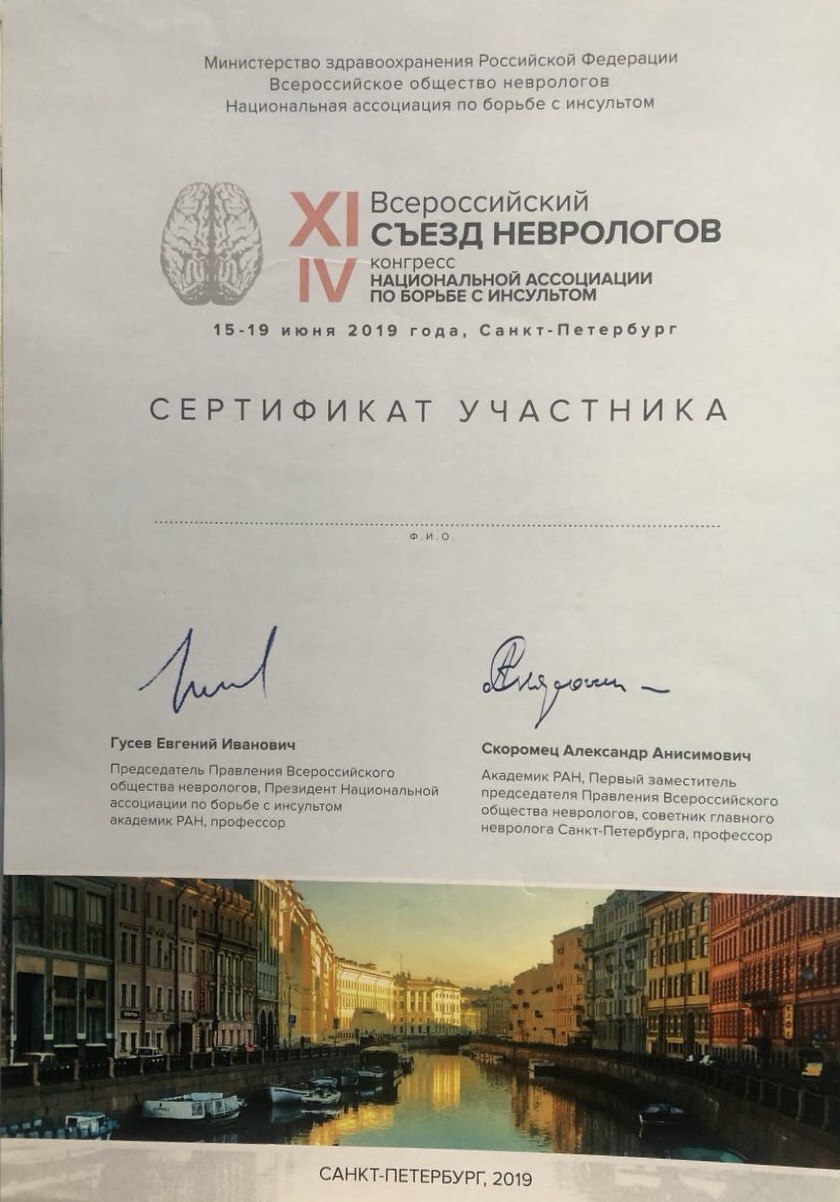 - 2019 г. – IX Балтийский конгресс по неврологии.