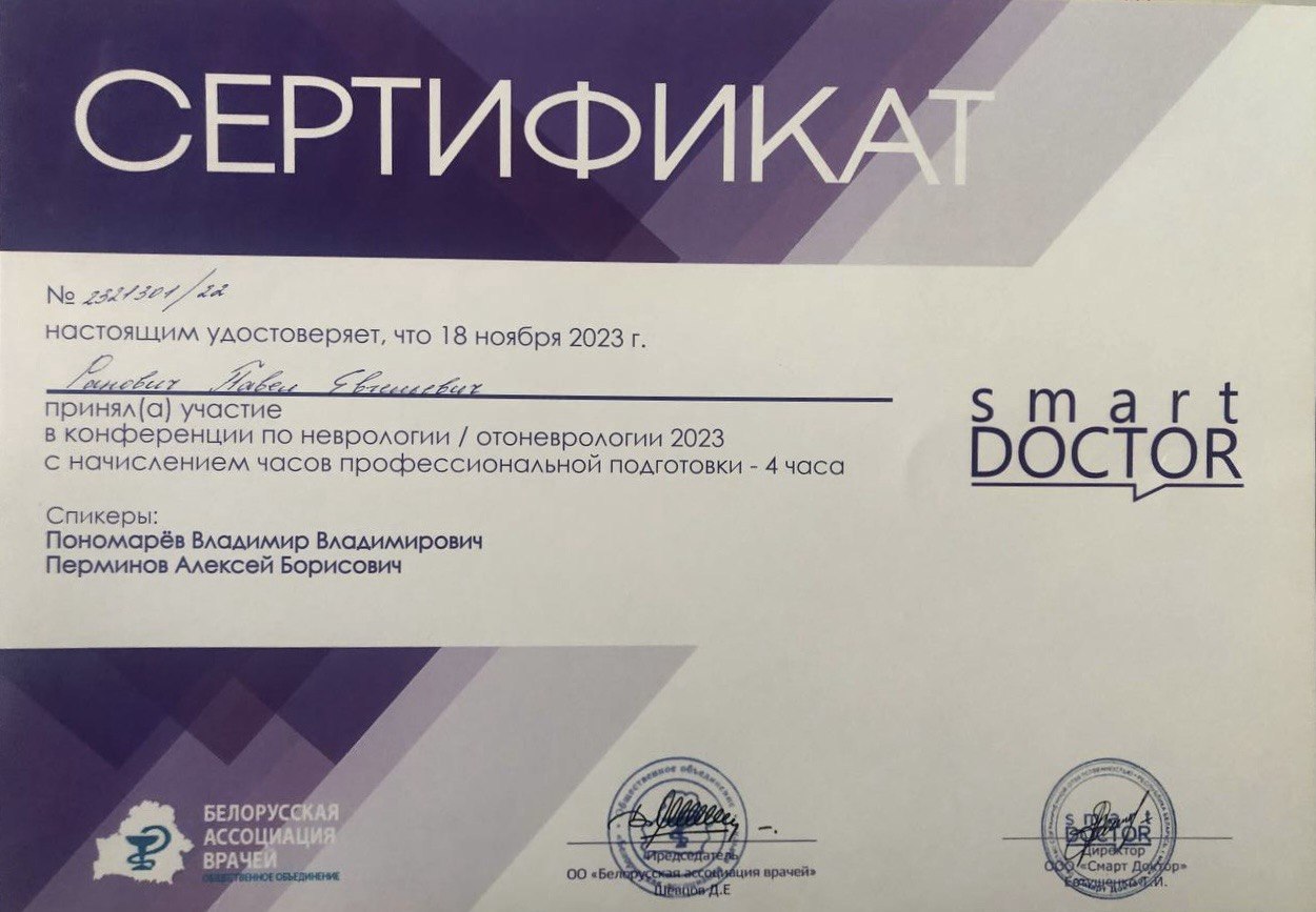 - 2004 г. – «Первичная специализация по неврологии»;