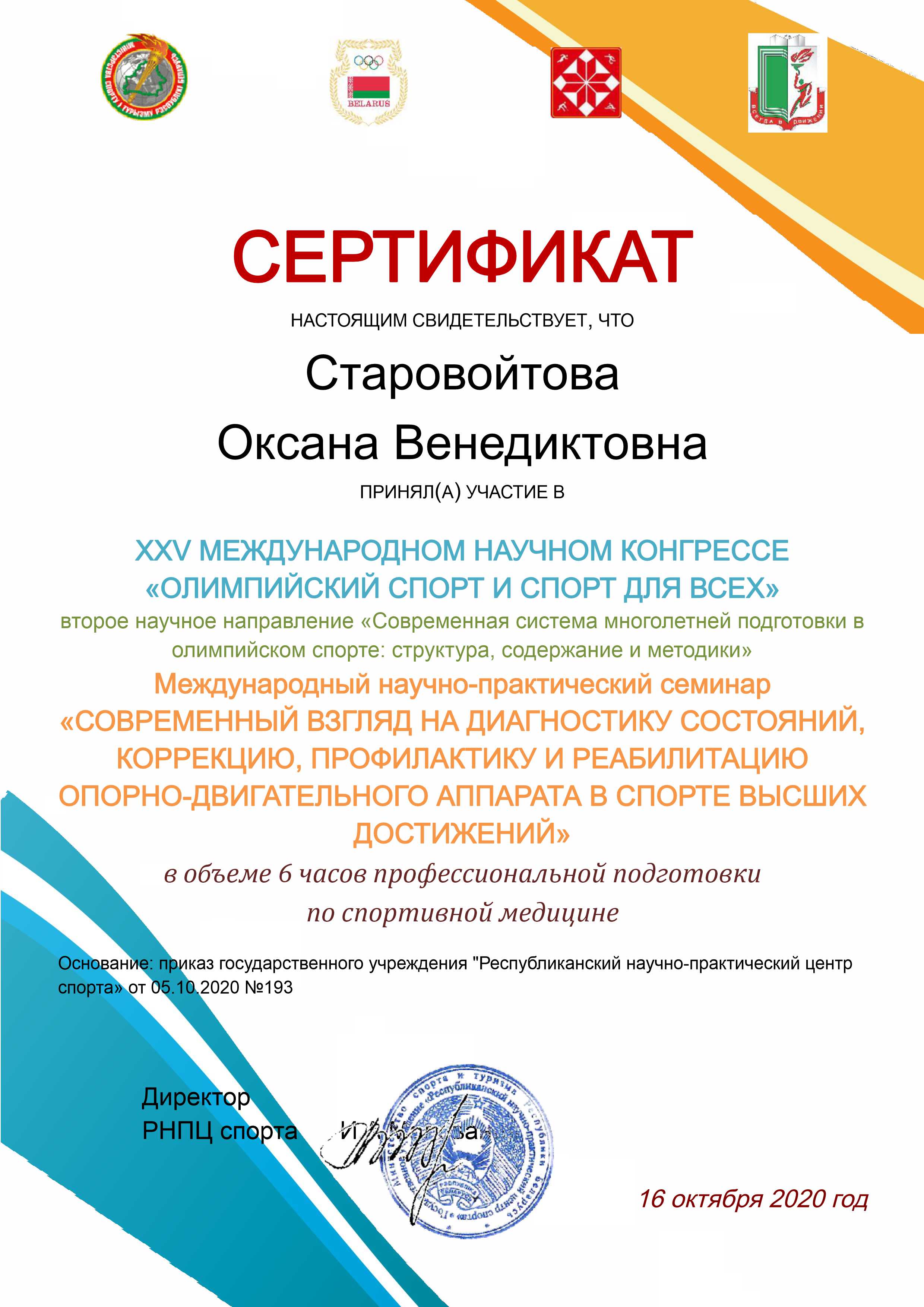 2020 г., Минск – 25-й международный научный конгресс «Олимпийский спорт и спорт для всех», РНПЦ спорта;