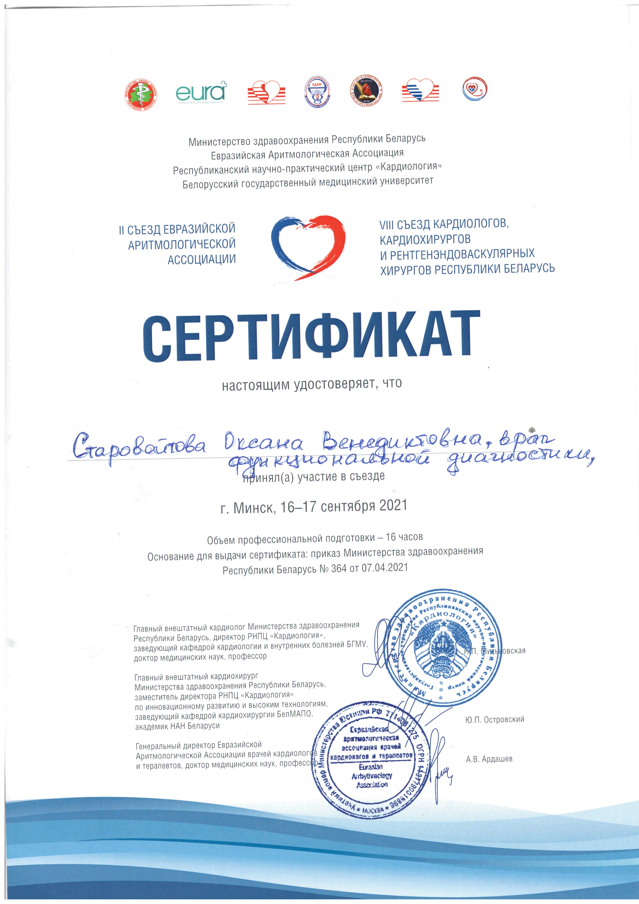 2021 г., Минск – 8-й сьезд кардиологов, кардио-хирургов и рентген-эндоваскулярных хирургов РБ и 2-й сьезд евразийской аритмологической ассоциации, Минский государственный медицинский университет;