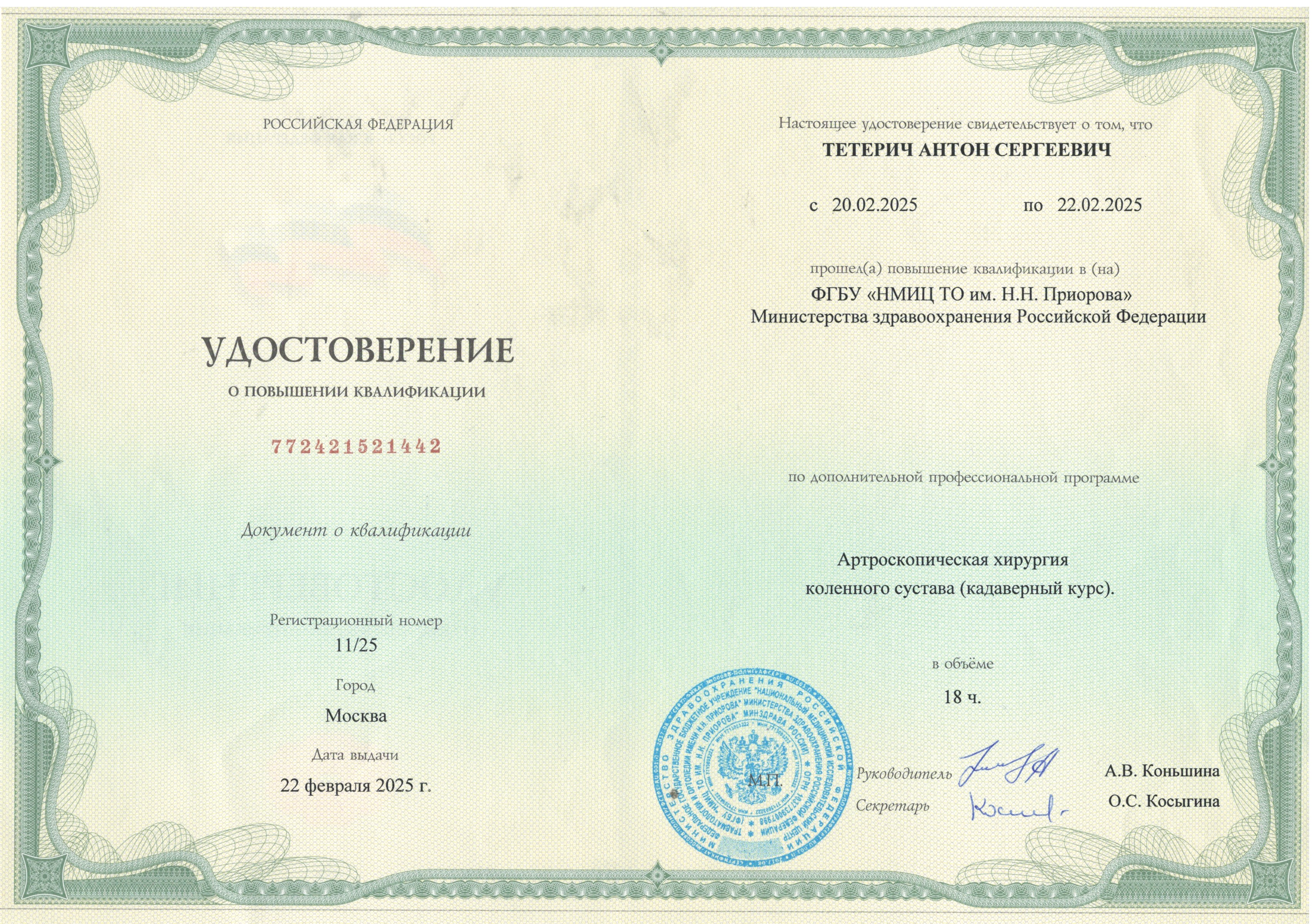 - 2018 г. – первичная переподготовка по специальности "Травматология и ортопедия" на базе ГУО БелМАПО (г.Минск).
